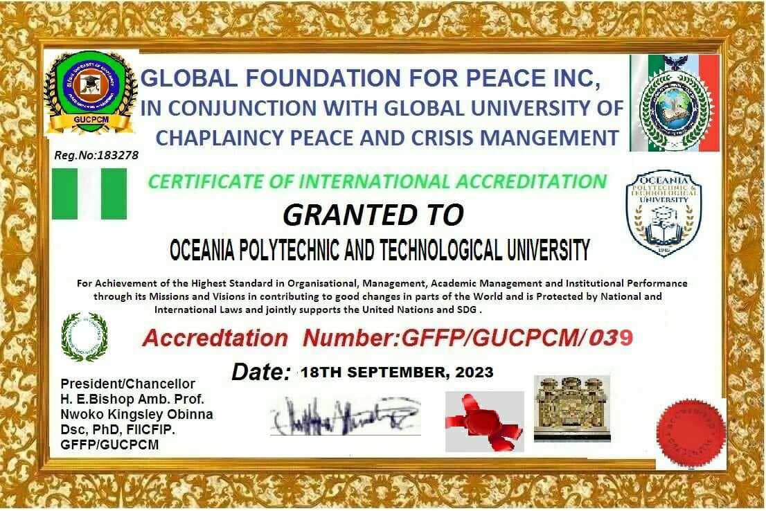 The university, under the umbrella of the Global Foundation for Peace Inc., operating as the Global University of Chaplaincy Peace and Crisis Management in Nigeria, has obtained the Certificate of International Accreditation on September 18, 2023, denoted by the code GFFP/GUCPCM/039. This accreditation substantiates the institution's dedication to delivering education in peace and crisis management at a global standard. It signifies the university's alignment with the rigorous criteria set forth by the Global Foundation for Peace Inc., consolidating its position as a provider of quality education in these crucial fields.