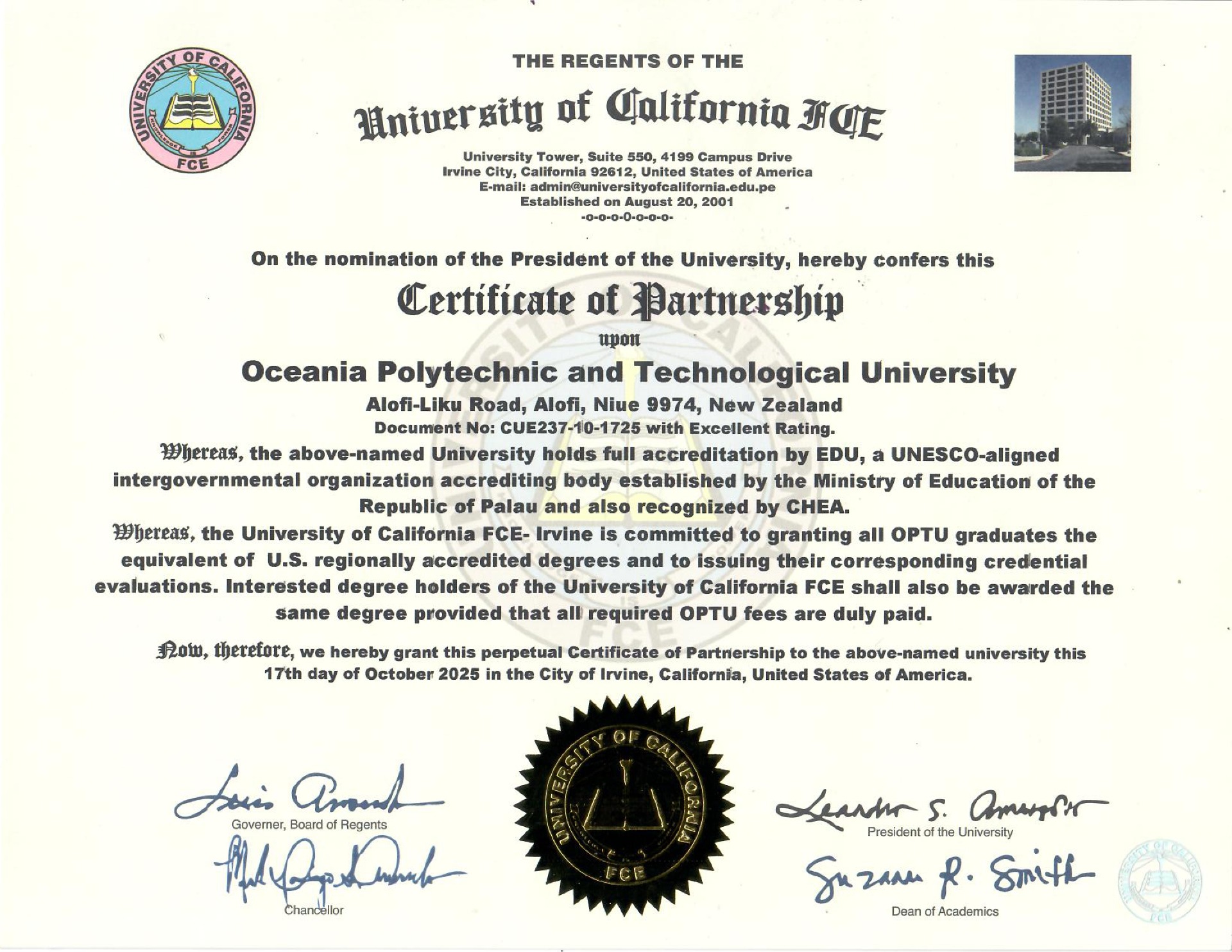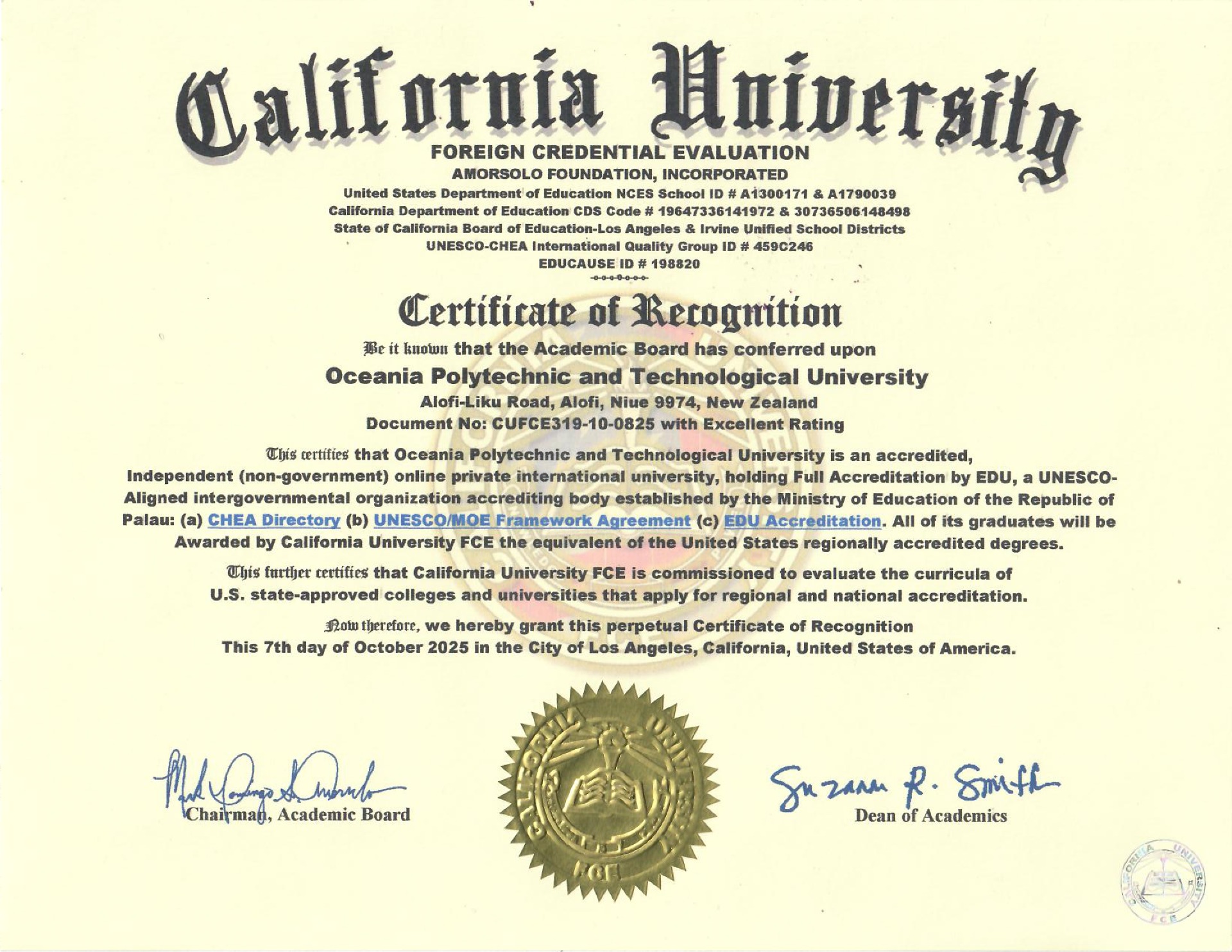 Oceania Polytechnic and Technological University (OPTU) has been officially granted a perpetual Certificate of Recognition by the California University Foreign Credentials Evaluation (CUFCE).