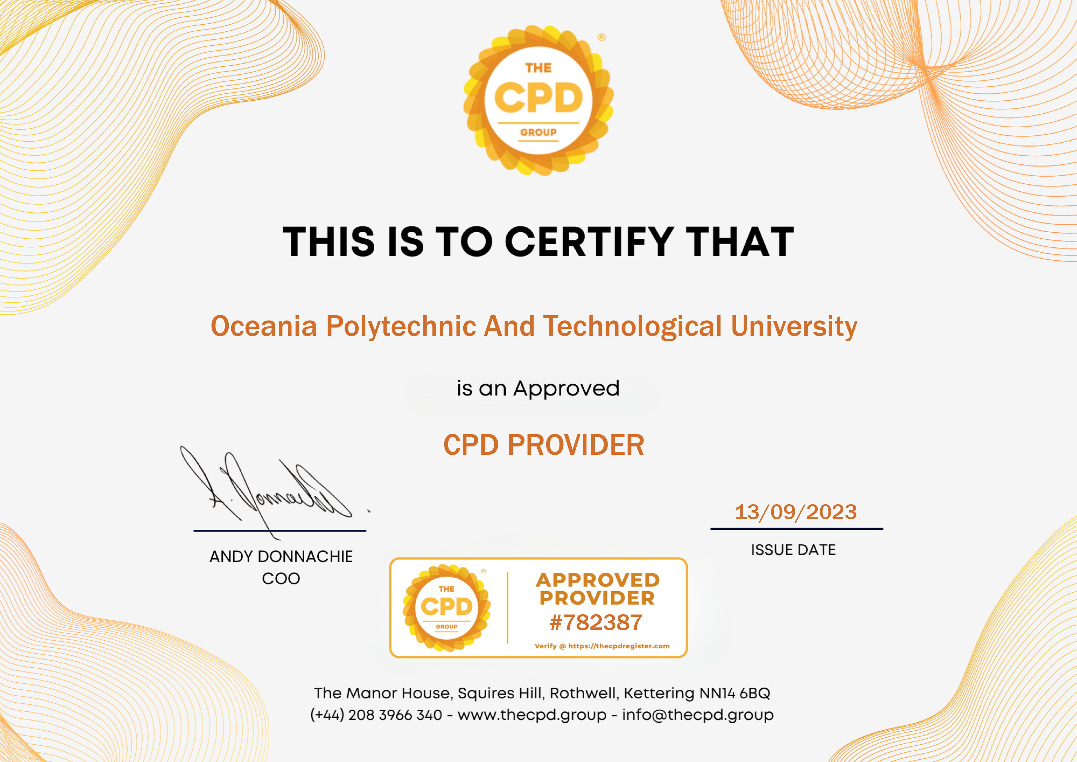 Oceania Polytechnic and Technological University is proud to announce the renewal of its certification as an Approved Continuing Professional Development (CPD) provider by The CPD Group in the United Kingdom. With the new registration number 786524, this recognition reaffirms the university's commitment to delivering high-quality learning opportunities that support professional growth worldwide.