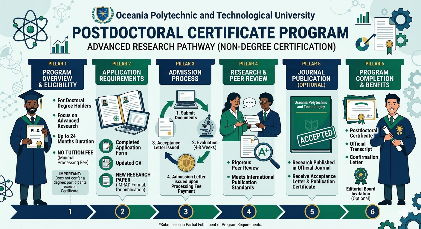 This section outlines the requirements and procedures specifically for the Postdoctoral Certificate Program at Oceania Polytechnic and Technological University. Please note that this is a non-degree program focused on advanced research and scholarly contribution.